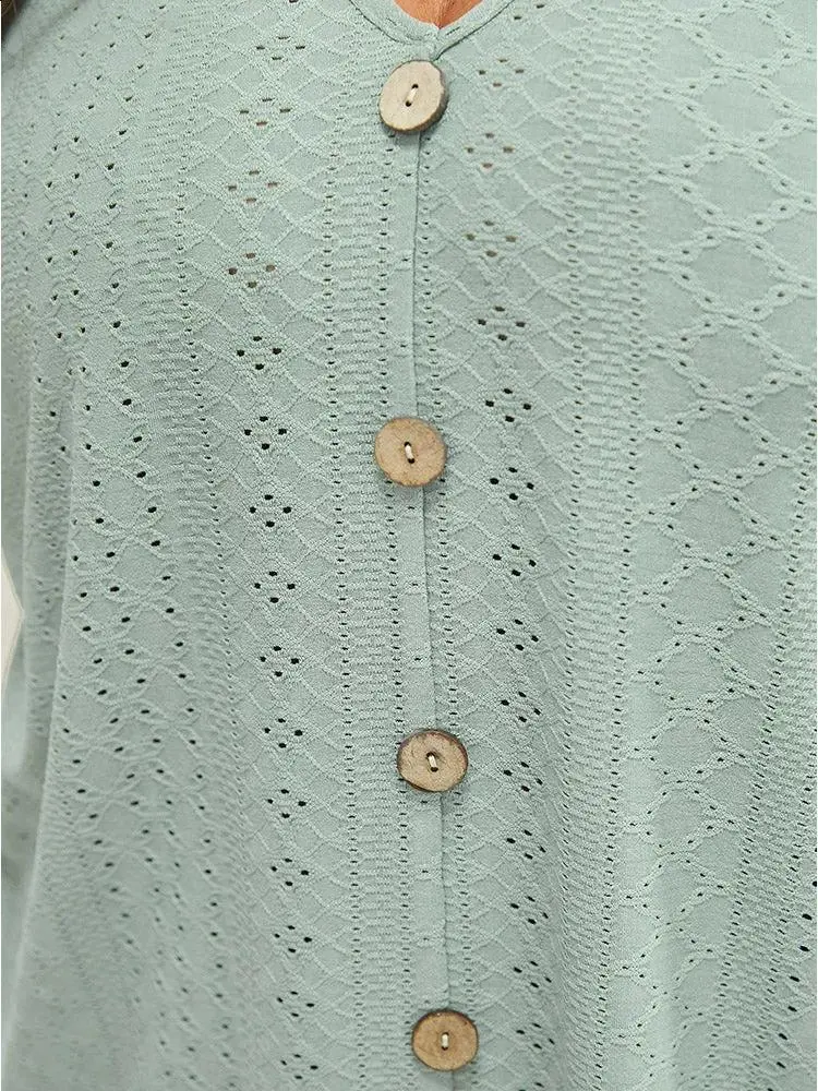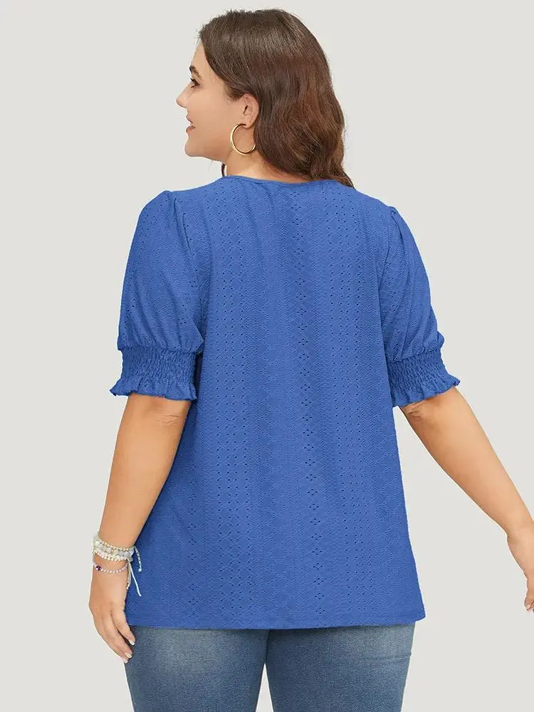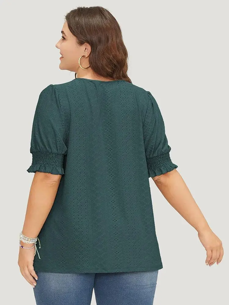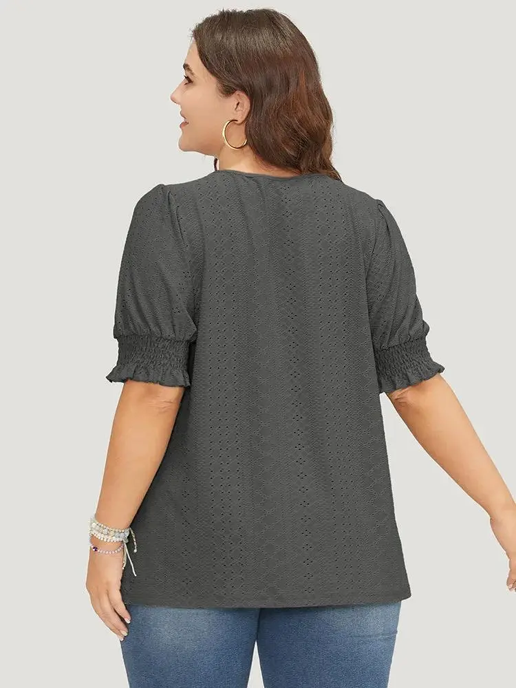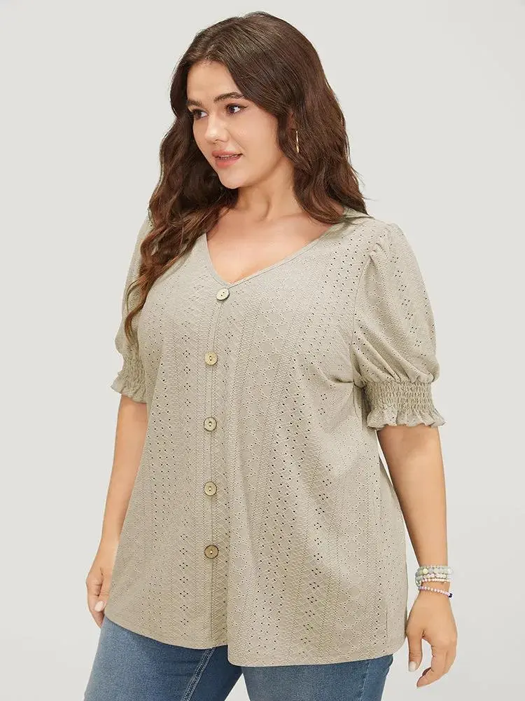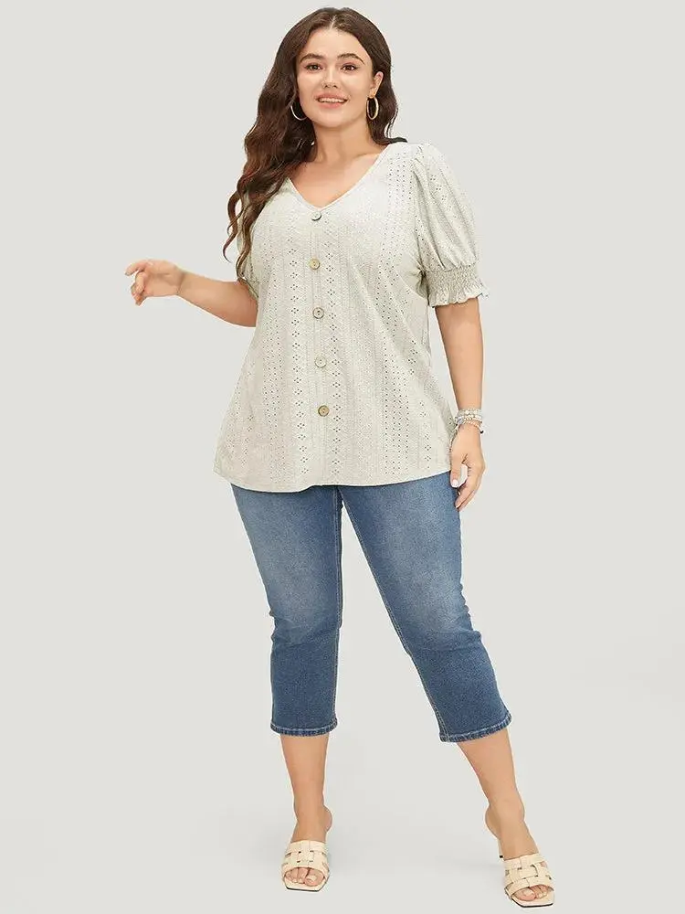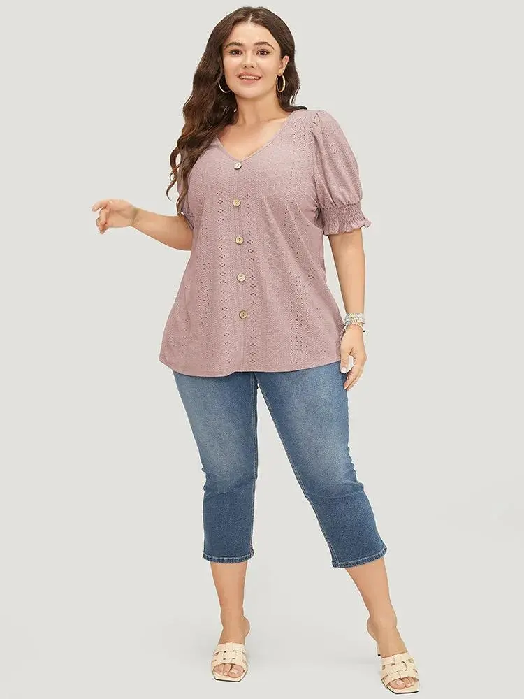 Plain Broderie Anglaise Shirred Puff Sleeve Button Detail T-shirt